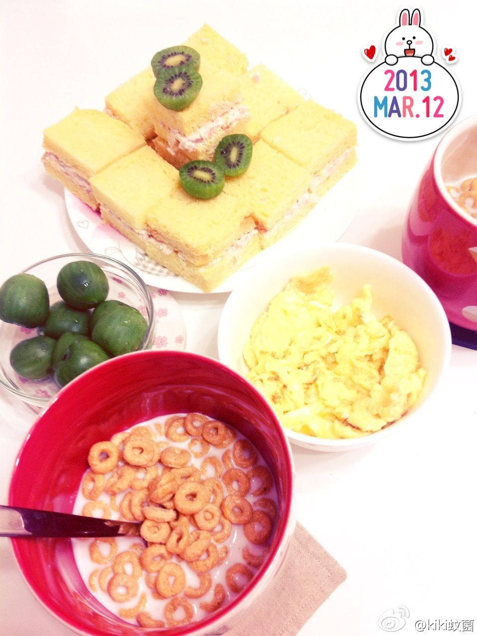 金枪鱼沙拉三明治+嫩炒蛋+牛奶脆谷乐+奇异莓。奇异莓很有意思,一口一个的大小,口感和奇异果一模一样。