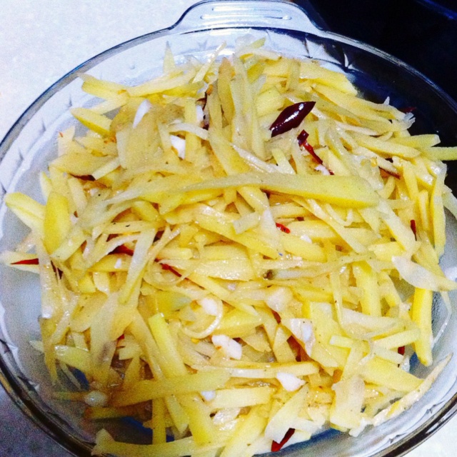 土豆丝切好多过几遍水,然后用饮水机热水过一遍然后继续过凉水。米醋不够酸于是放了好几遍,最后土豆丝灰常脆爽。