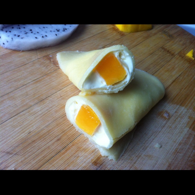 芒果班戟 还尝试了火龙果口味 貌似鸡蛋少了皮颜色不好看 而且摊的又厚又小 有点小伤心