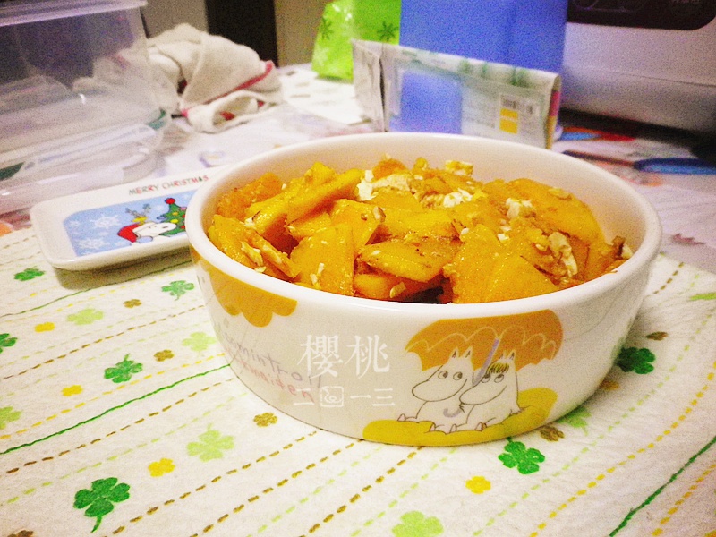昨天做南瓜粥多出来的南瓜,加上闲置的咸鸭蛋~味道不错~嘿嘿!