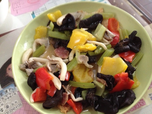 随便找来几个色彩鲜艳的炒炒,颜色很好味道一般,买的现成锅巴简直是败笔。