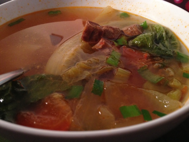 猕猴小桃夸 做过 番茄牛肉汤 天冷了本来就超乎常人的胃口又大了一点五倍,下午看着电视剧突然好想喝清爽的番茄牛肉汤。牛肉和番茄洋葱芹菜翻炒后再一骨碌倒进高压锅压了30分钟。没有小青菜了,出锅前加了几片生菜叶,配着用剩菜做的蟹黄饭,香! 2013-10-16