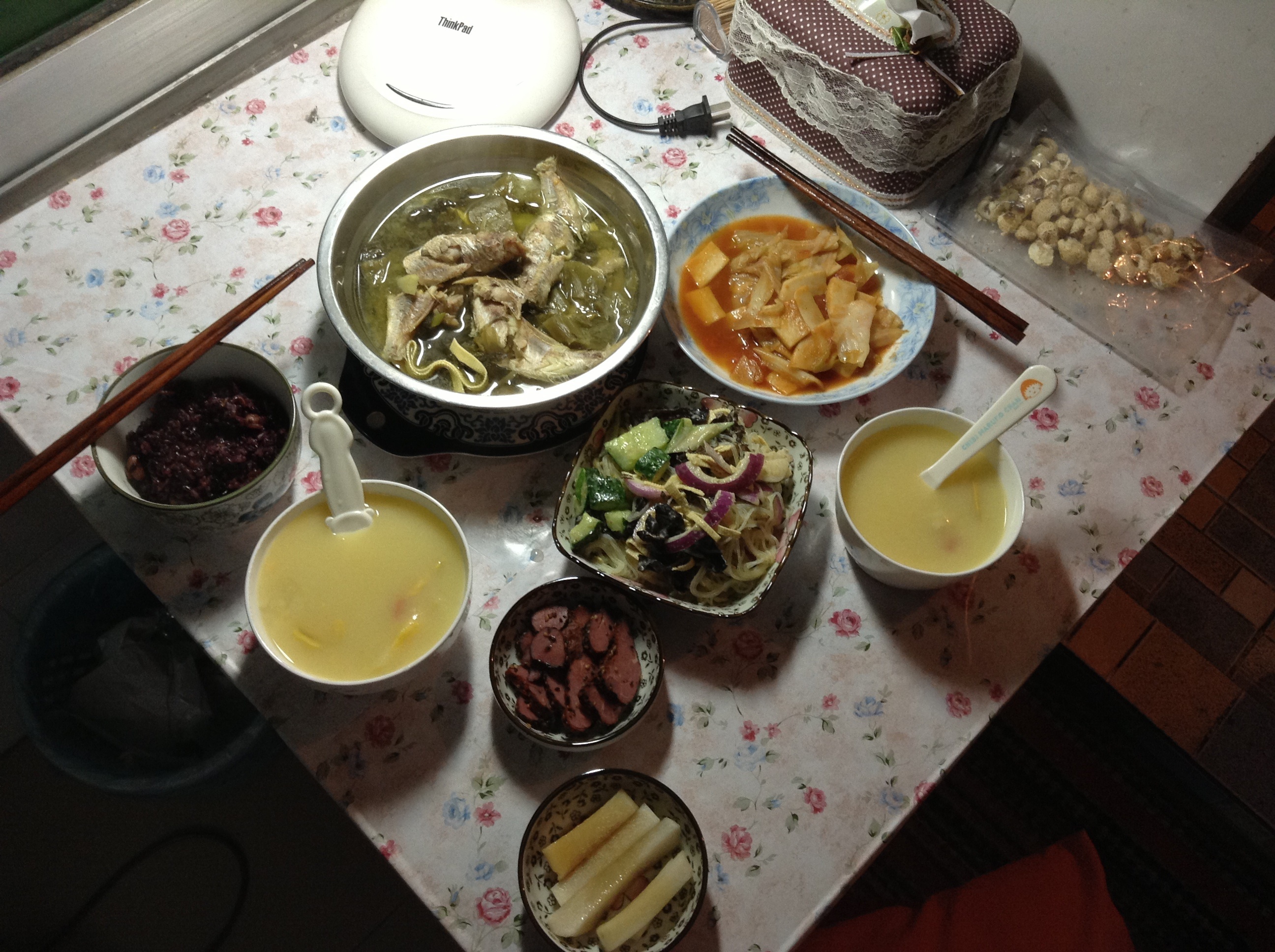 今日晚餐:酸菜炖红杉鱼,芥末粉丝豆皮,茄汁包菜杏鲍菇,香辣卤牛肉,泡萝卜,红薯玉米粥,杂粮米饭〜吃太撑了,作为夜宵的小蛋糕估计等会儿才吃得下〜