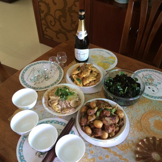 年初二女婿回门,妈妈做的一桌子菜,好吃!(蛋角、手撕鸡、慈姑焖炸猪肉、凉拌小木耳)