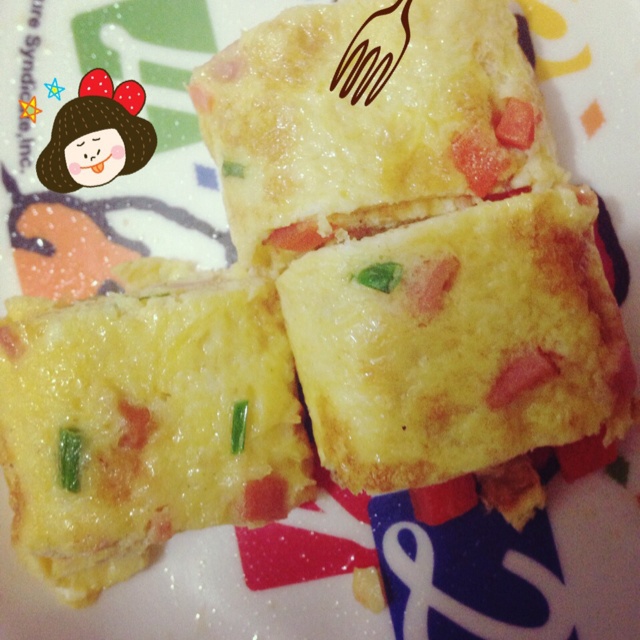 我的胡萝卜和火腿切大了。下次小点。不过蛋皮一次成功~