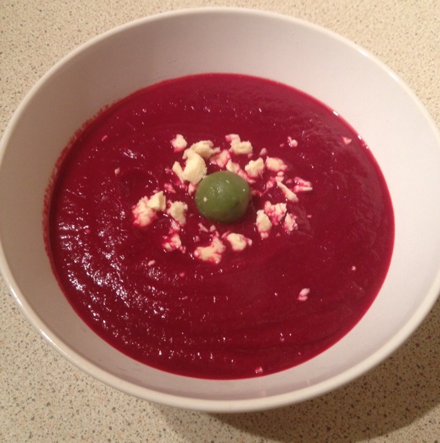 紫菜头汤加 crumbly cheese,加了一棵橄榄。我想没有人吃过吧。嘿嘿...