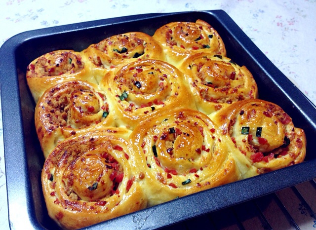 早餐:不爱吃那么甜的水果干,所以把君之方子里的馅料改成了咸味的香葱和肉松香肠,味道也很棒。葱香肉松香肠面包卷+小米粥+水果