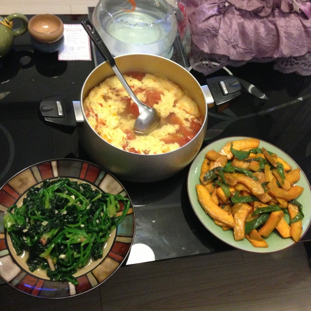 蒜茸菠菜、青椒炒老南瓜以及番茄蛋汤(最近真是好喜欢番茄呢)