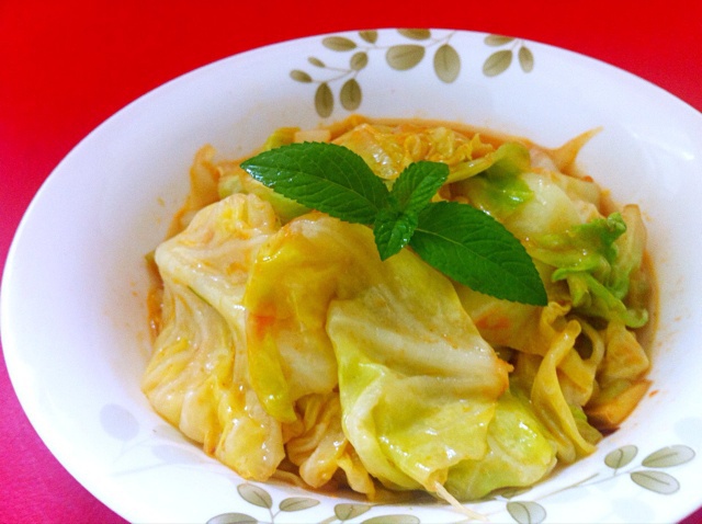 蕃茄酱炒圆白菜,再加点孜然粉,味道不错~