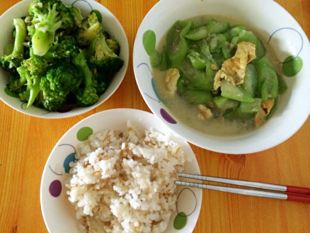 丝瓜炒蛋,蒜蓉西兰花,杂粮米饭