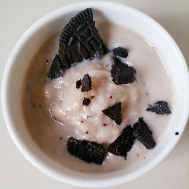 家里芭蕉吃不完,放搅拌机打成泥状,再加纯牛奶搅拌,放冰箱,撒上碎的奥利奥,完事~