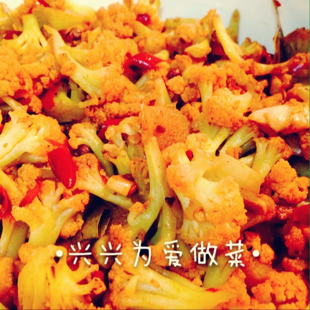 兴兴一闪一闪 做过 很“浪费”米饭的家常菜之一-------干锅菜花 豆瓣酱真是一味神奇的调料。之前男票也做过这道菜,很好吃。今天开始做这道菜的时候男票已下班,于是帮我剪菜花。为毛不手撕?翻炒的时候菜花朵朵上沾染了豆瓣酱的红色,梗是淡黄色,锅里就像一条在舞动的碎花小裙子。 #午餐•2014年7月18日# 2014-07-18