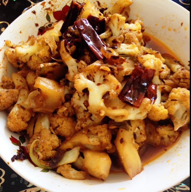 青青子骥 做过 很“浪费”米饭的家常菜之一-------干锅菜花 很成功,秘诀就是一定要下水焯一分钟,容易入味,但是今天炒豆瓣酱的时候,火太大了。后来不得不盛出豆瓣酱,再次放油。导致葱姜蒜的香味没有释放,油稍微多了。最后的香油很香,提味的关键。其实我认为应该稍微加一点点鸡精会更好。给自己点个赞 2014-07-31