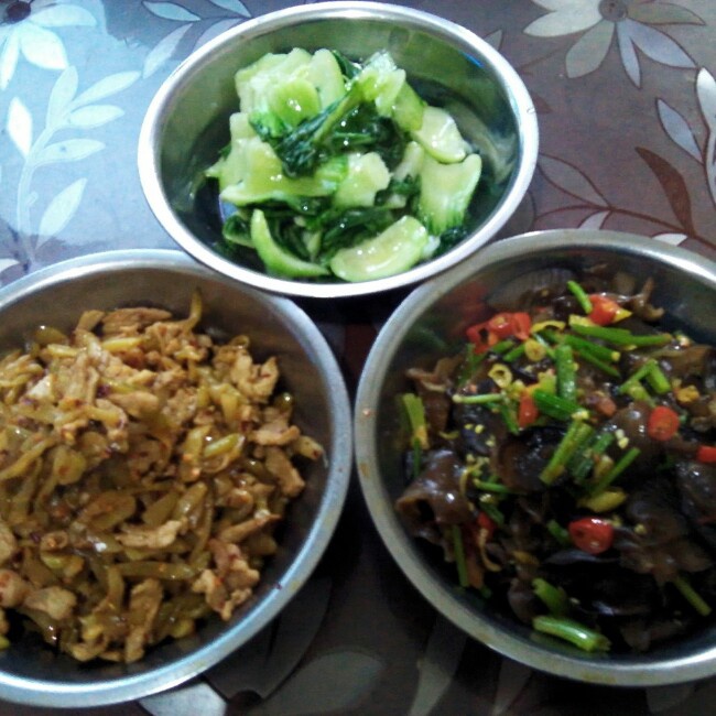 一家四口的家常菜:榨菜炒肉、炒木耳、清炒上海青。