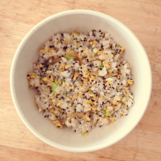 家里就剩下一颗鸡蛋、一段葱了…就着昨天冰箱里的剩米饭,加点咸菜和黑芝麻,一个人的简易午餐^o^
