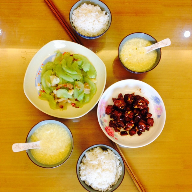 猪油渣炒白瓜,糖醋排骨,蛋花玉米羹