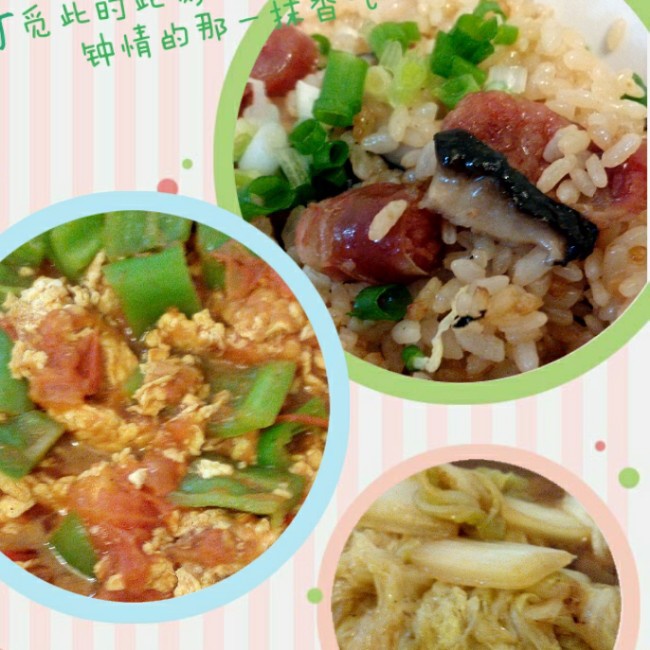 腊肠饭+西红柿炒鸡蛋+醋溜白菜