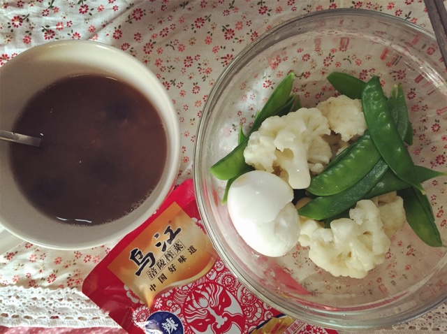 杂粮粥 + 水煮蛋 菜花 荷兰豆 + 乌江鲜榨菜片~