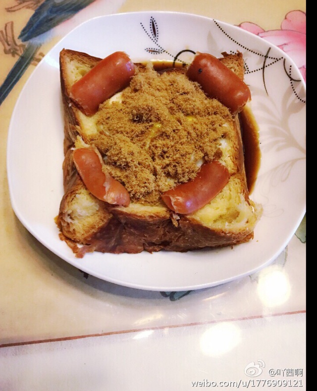 简单好吃 下面是黑椒汁 肉松下面盖住了一个鸡蛋