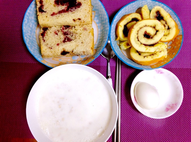 今日早餐:牛奶燕麦粥,煮鸡蛋,蓝莓蛋糕卷,紫薯面包。报告完毕!^_^^_^