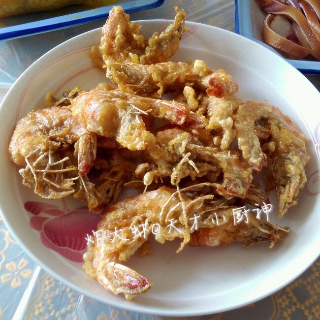 炸大虾。裹上蛋液和面粉,下油锅,简单美味
