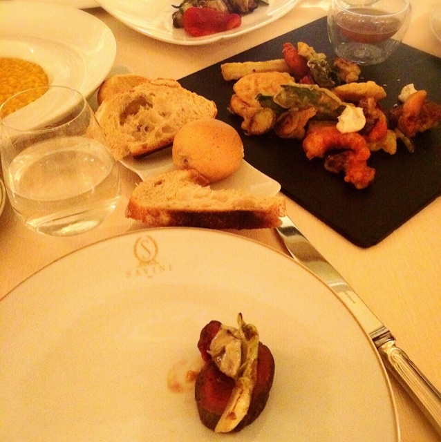 晚餐是麻麻的同学,来米兰看家具展的叔叔阿姨破费,我们在Emanuele二世长廊Prada对面的百年老店二楼吃了晚餐。头一次尝试鹿肉,用红酒和威士忌渍过了,没有腥味,带着血水肉质也比牛肉更细嫩。餐前的芦笋奶酪野菜泥也很有春天的味道,今天也是第一次吃松露,说实话我是对菌类一点好感都没有,难得吃一次都很反胃的,可能是黑松露也金贵,薄薄一片能闻到一丝香味就差不多了,入口嚼了几下是能感受到黑金子的魅力啊,不过给我吃还是有点糟蹋了好食材哈。