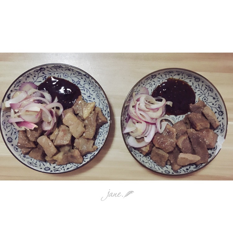 两块西冷牛排切成小块煎的,配好的香草黄油和黑椒汁,口感很嫩~