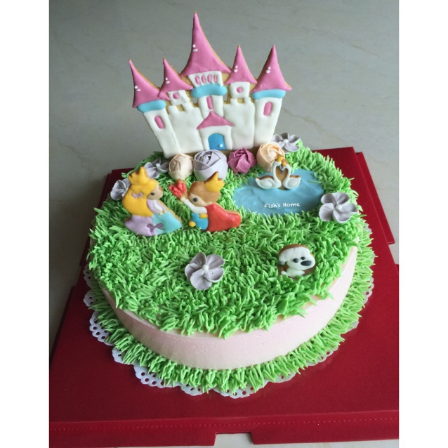 顾客说要个城堡,有对儿恋人,有对儿白天鹅,还有个狗和绿草地...就酱啦~