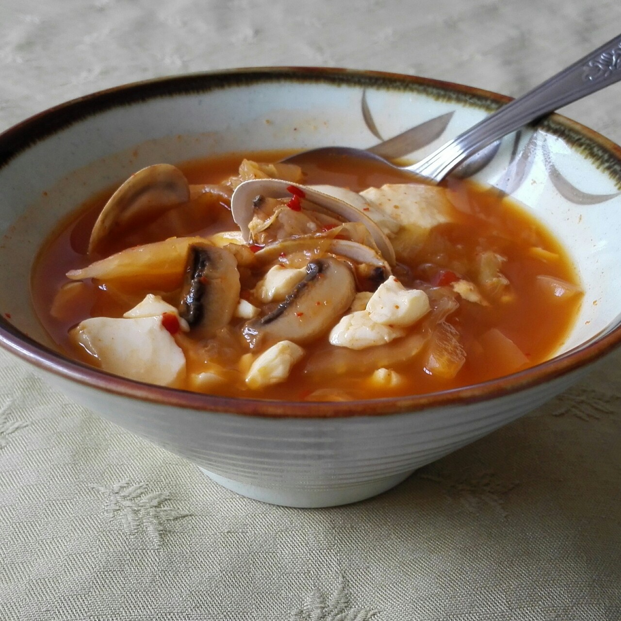 没有辣酱,只用了泡菜,很好喝呀,海鲜豆腐生菜为底料。