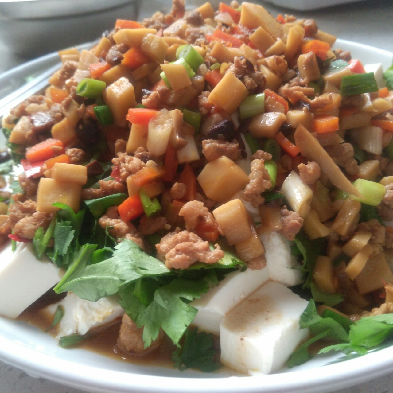 豆腐切块码在盘底,上洒一层香菜末,上面的浇头是炒的,肉末加香菇,胡萝卜,杏鲍菇,一点青蒜就ok了