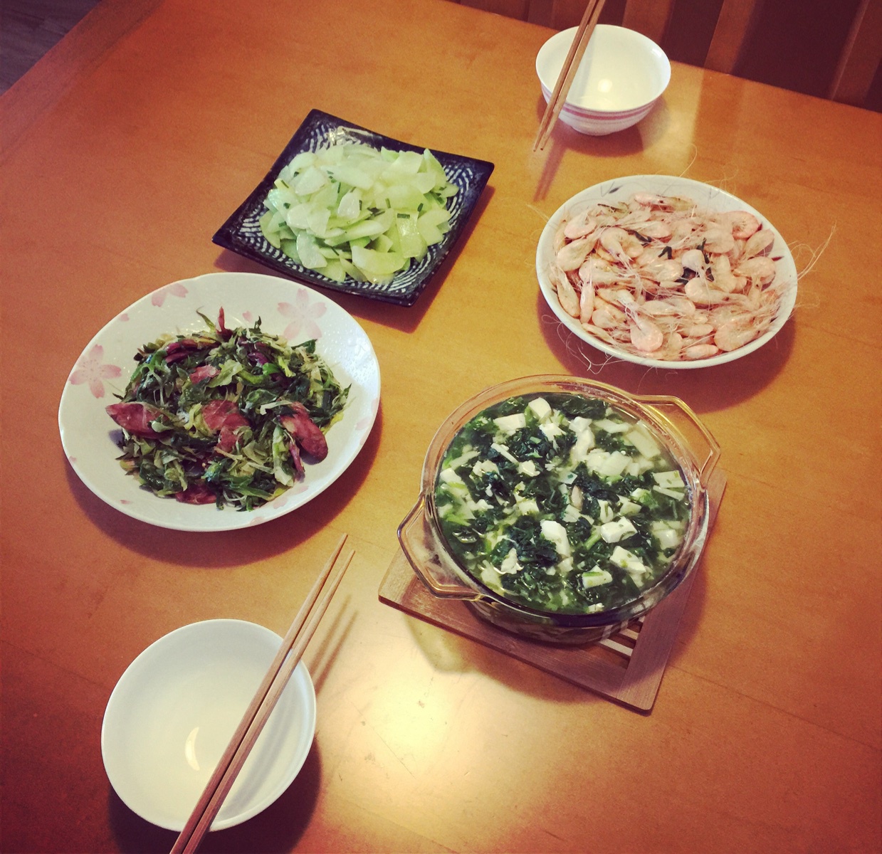 清炒莴笋 盐水白米虾 青蒜辣肠 荠菜豆腐羹