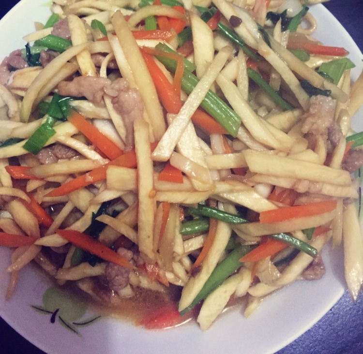 茭白炒肉丝芹菜红萝卜,味道好极了哈哈~