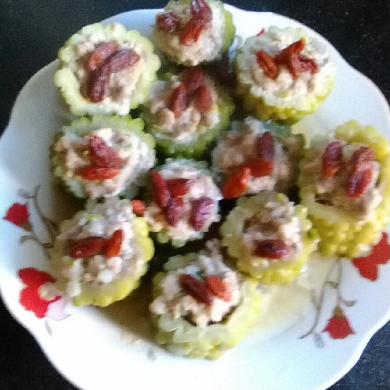 这是我从电视里学的哟,味道不错,是夏天里选择的好菜,苦瓜酿肉~!!