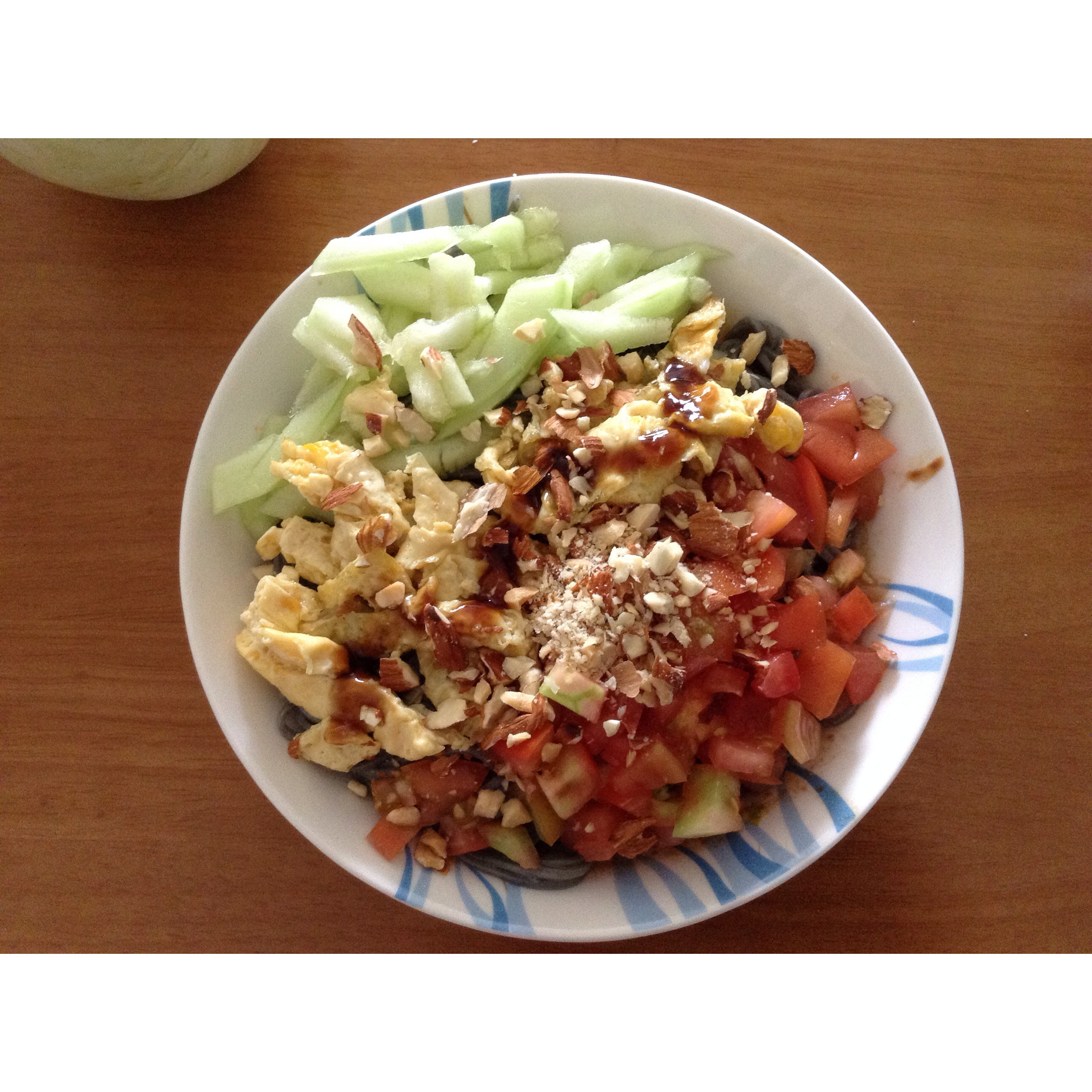 fee大神 做过 祖传半半拌面 因为是早餐,不想吃那么油,把肉末换成了滑蛋,加上是孕妇的关系..把豆瓣酱省略了,稍稍加了一点蚝油,芝麻酱认真弄了红茶来稀释调匀,果然有更香了。。 #早餐•2015年9月2日# 2015-09-02
