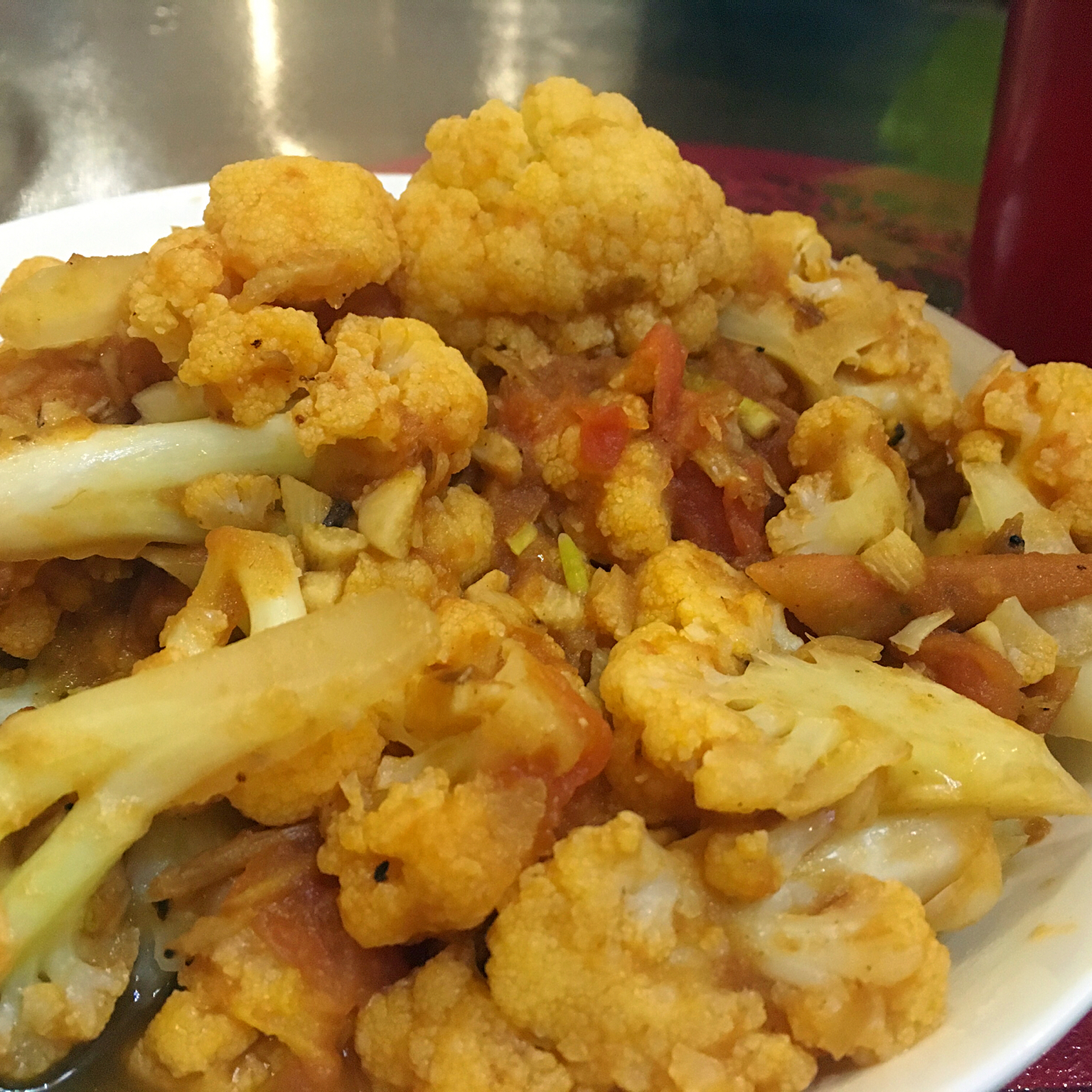 用番茄+番茄酱+虾皮烩,味道很好。这个方子是解决普通菜花不入味的好办法。