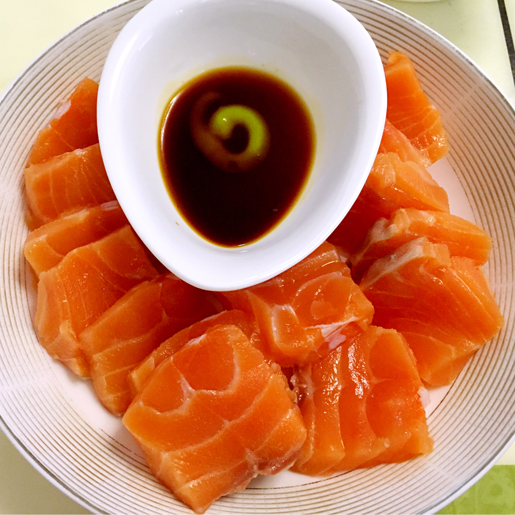 老公切的三文鱼…我只吃了一块。婚前不吃任何鱼生,婚后真是被他传染能吃一点点。
