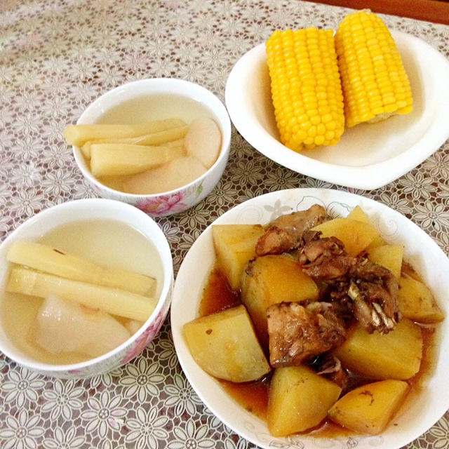 简单晚餐一锅蒸哈:冰糖甘蔗雪梨水,玉米,土豆蒸鸡腿,就一个鸡腿了,切吧切吧就那么几块◠‿◠