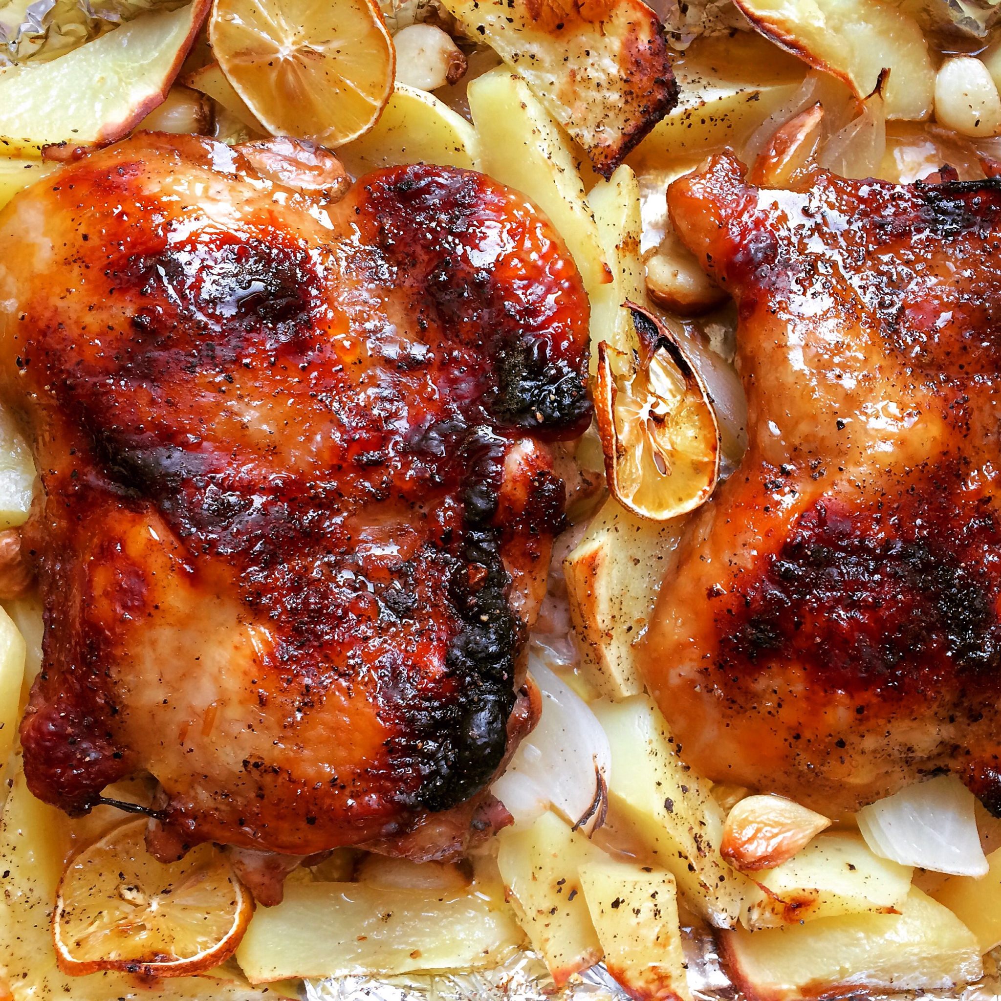 _odd_ 做过 午餐•2015年11月29日 烤了俩去骨鸡腿 用叉子扎N个眼儿 随性的用各种料腌了一晚上 大蒜土豆洋葱柠檬片随便放一放 230度上下火30分钟 最重要的是酸梅酱酸梅酱酸梅酱 重要的事说三遍 强过蜂蜜一百倍 边缘虽然有点糊 但是完全不影响口感 好吃的不得了啊不得了~ #午餐•2015年11月29日# 2015-11-29