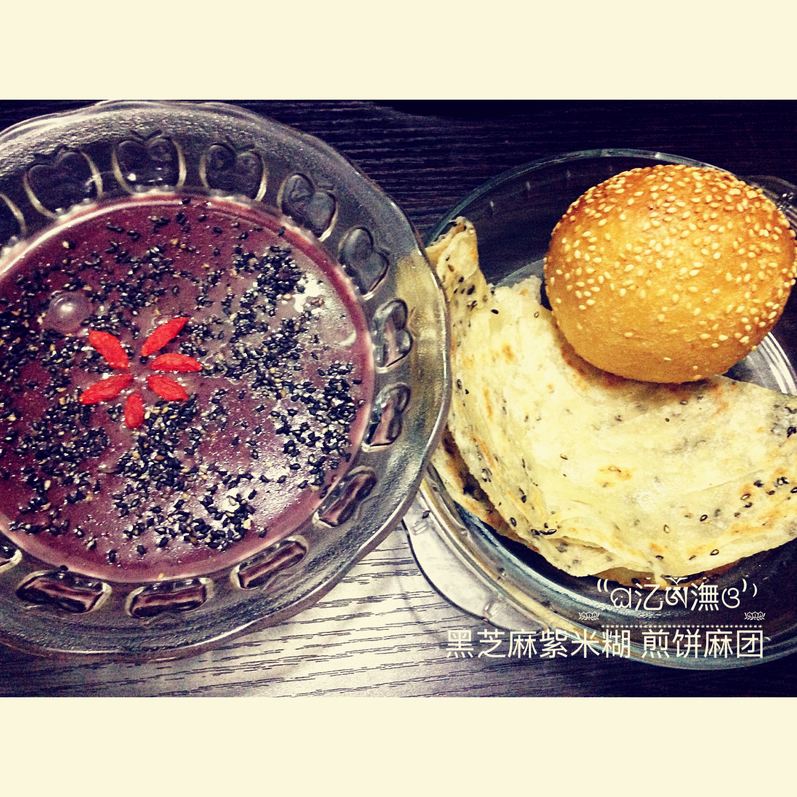 黑芝麻紫米糊,香酥手抓饼,外酥里嫩的麻团~香香的早餐是新的一天最美的开始