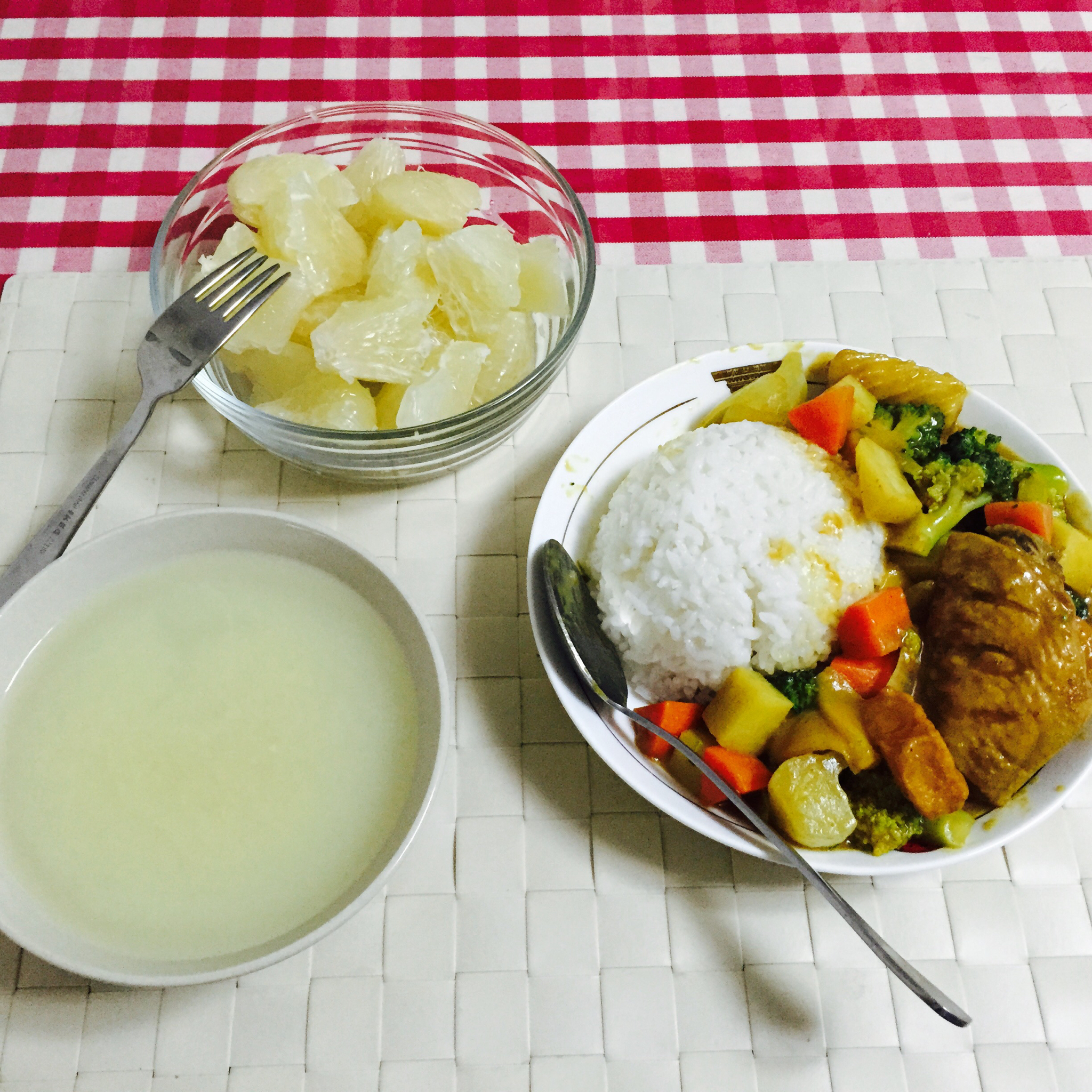 日子越长越明白甘心的付出才能让自己真心快乐,给杨先生准备的一人晚饭,小米稀汤,大柚子,咖喱。