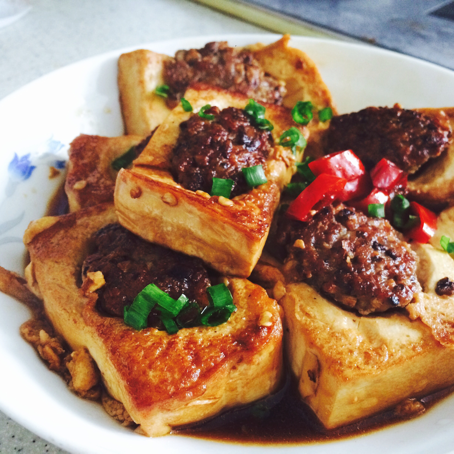 再次酿豆腐,加了泡椒收汁~有点辣味很美好~