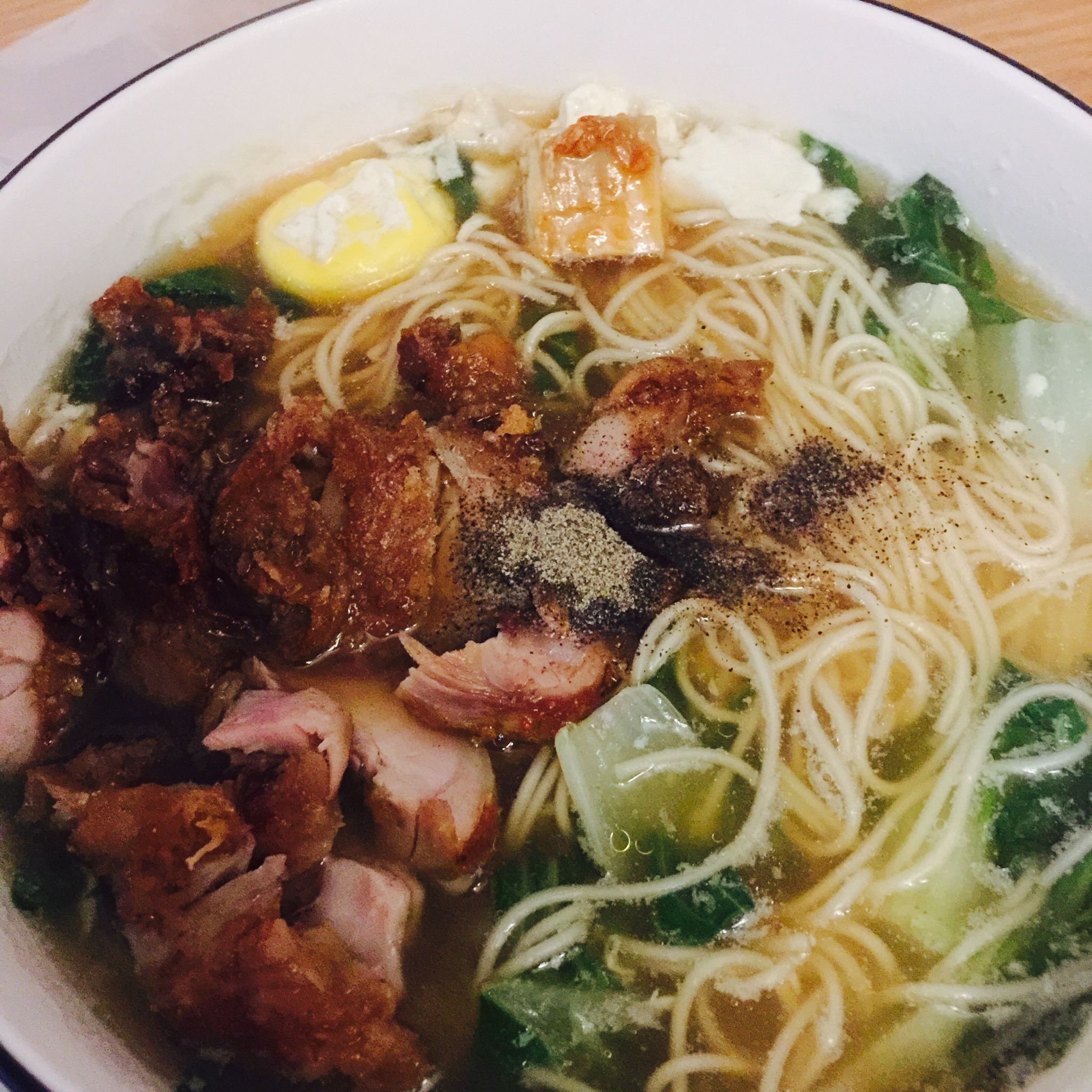 小火重新煎了一下,青菜龙须面加蛋,酱油汤打底,撒上多多黑胡椒~啧