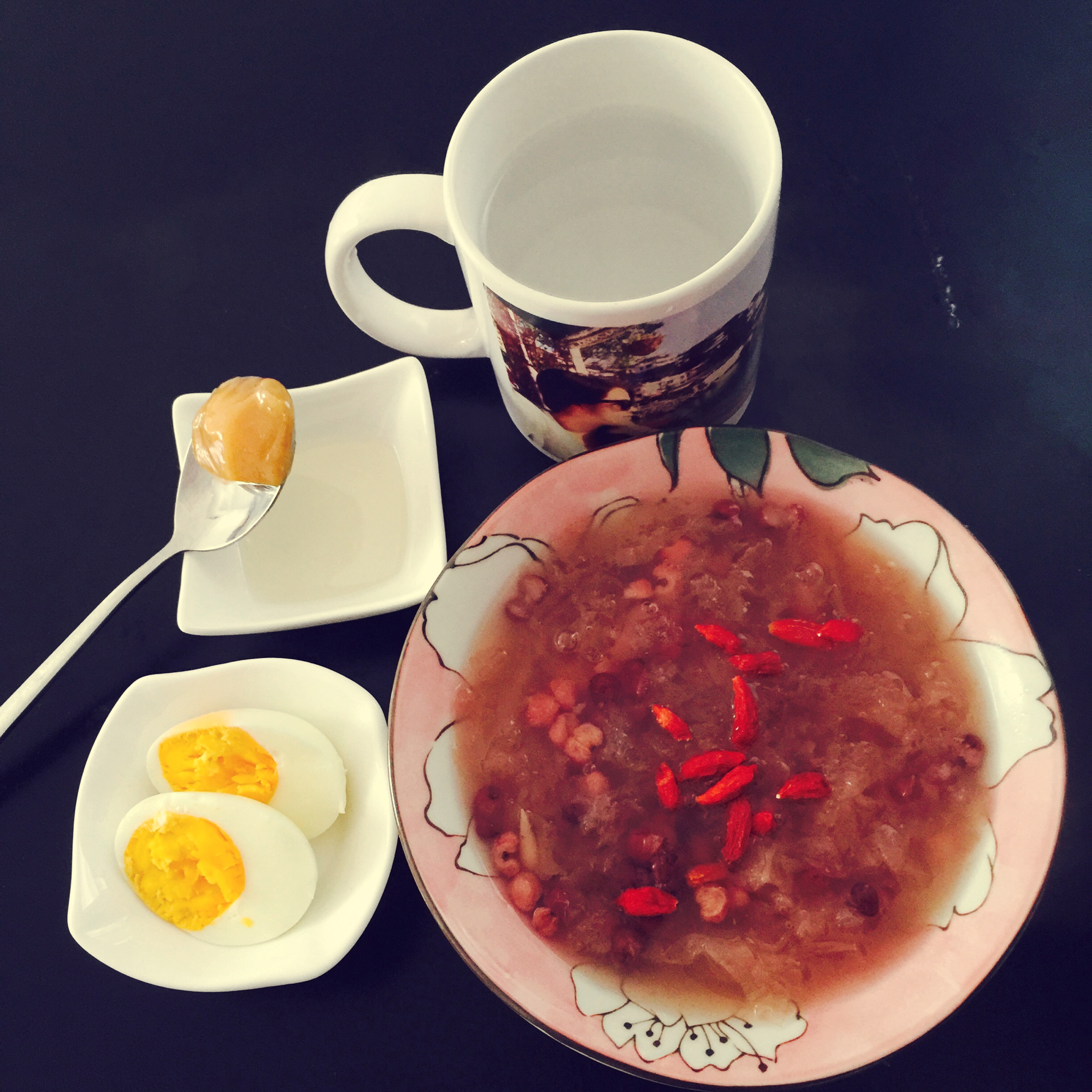 Miss马大哈哈哈 做过 早餐•2016年2月27日 薏米红豆百合炖银耳一碗+白煮蛋一个+麦乳卡蜂蜜一勺,美好的周六,吃完擦地板。哈哈哈哈。。。 #早餐•2016年2月27日##🍐的早餐# 2016-02-27