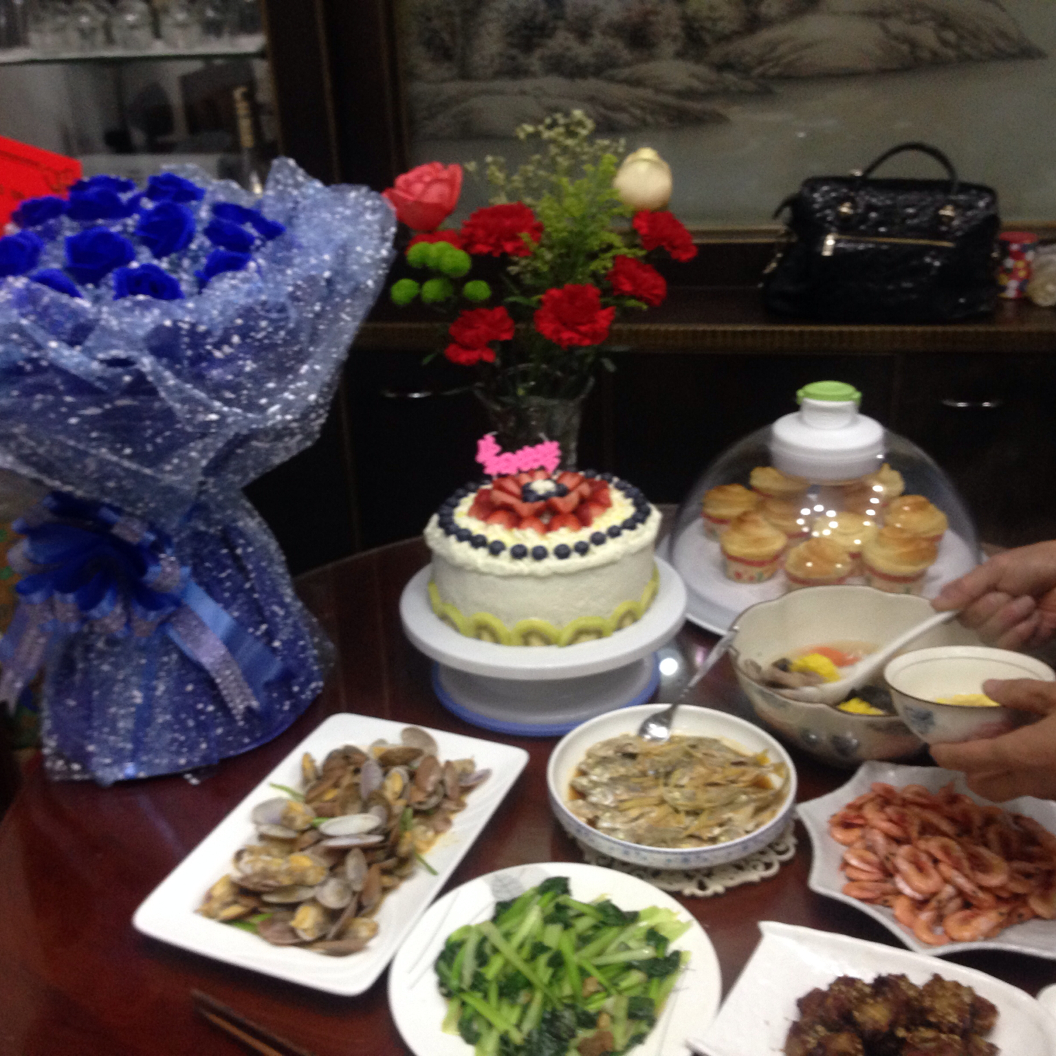 生日宴都做了些简单的家常菜,儿子中午放学在回家的路上买回来了鲜花送给我,“图七照片是孩他爸拍下来的,在门口着急的让爸爸进去一块买花的表情”,二姐也送了一大束蓝玫瑰!
