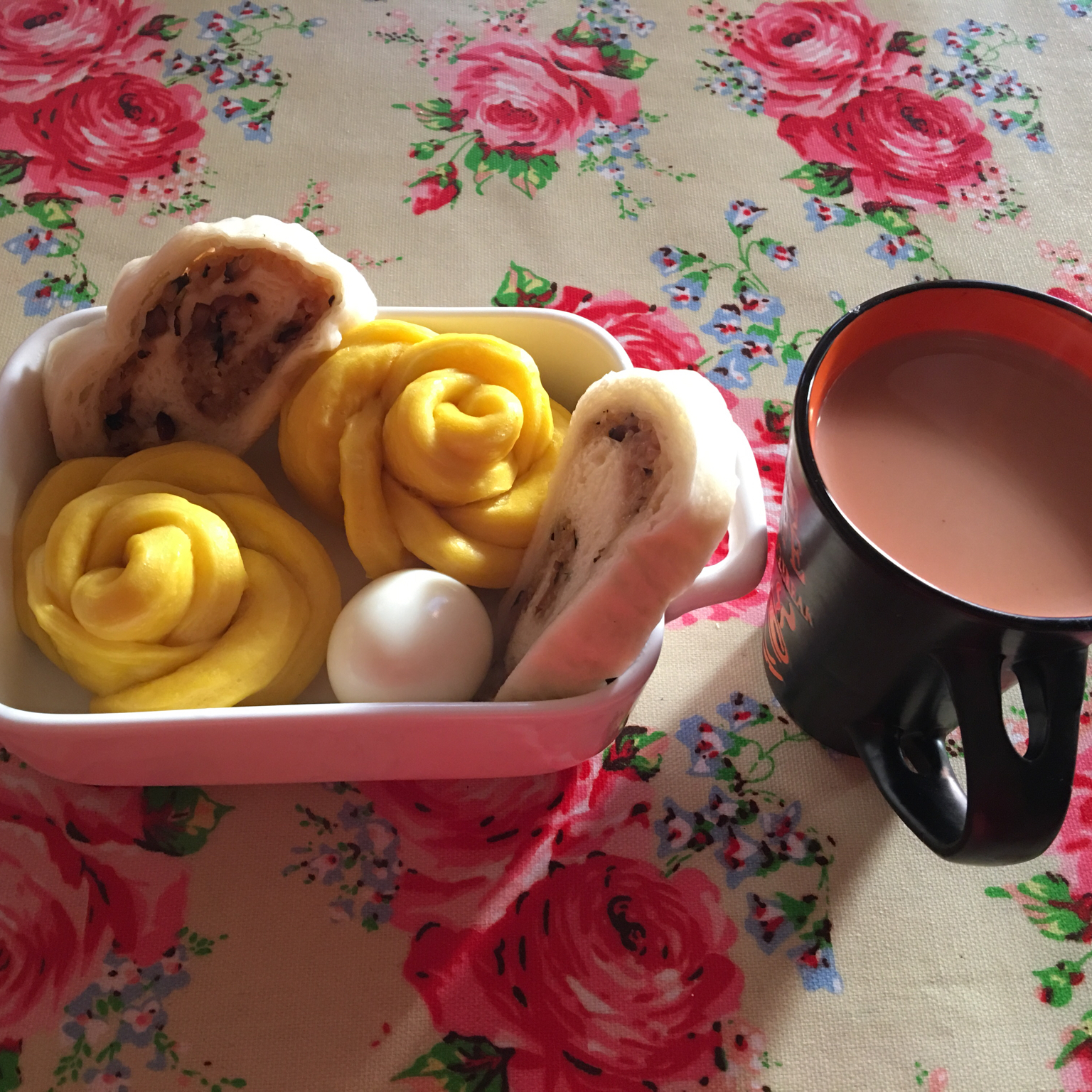 早晨。。早餐好丰富南瓜馒头,糯米卷,鸡蛋,奶茶