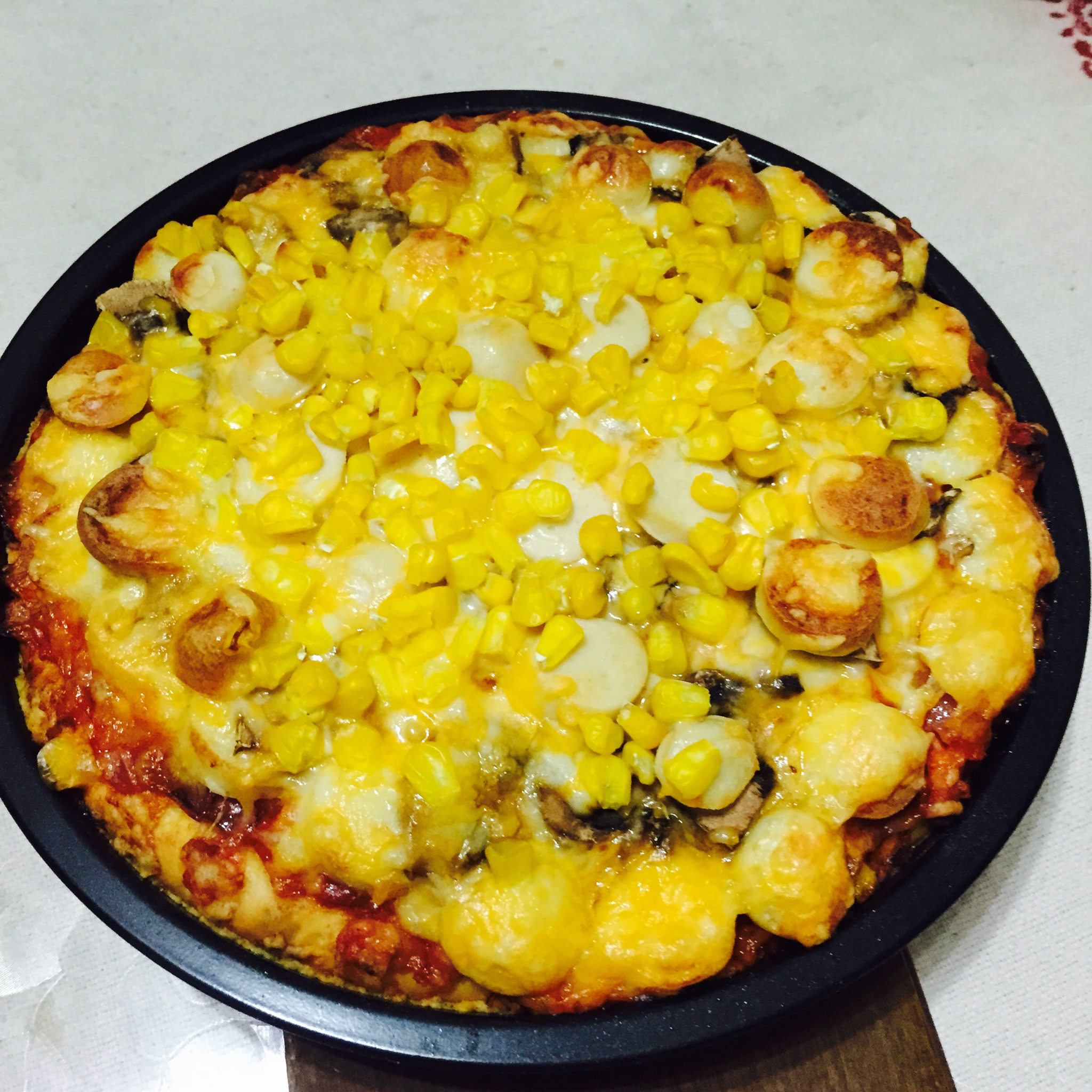 料重,放了5根鸡肉肠,三颗大口蘑,一堆玉米,真的好好吃!