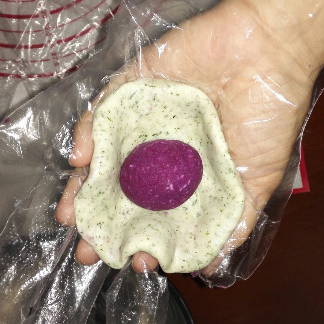 艾叶,椰蓉紫薯草莓酱馅。
