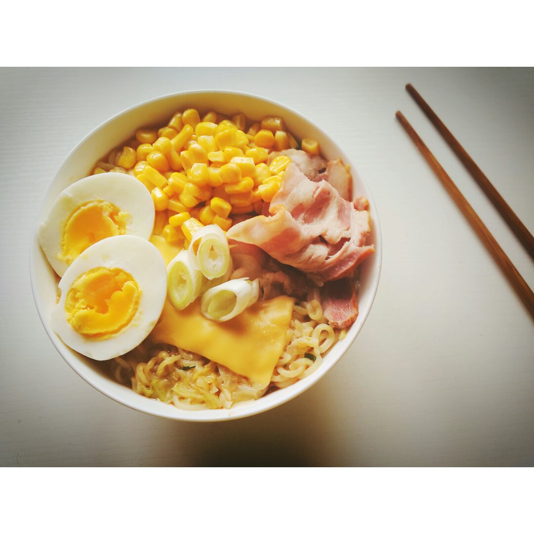 用了味增拉面,加了培根和蛋糕,好看又有好吃(ღ♡‿♡ღ)