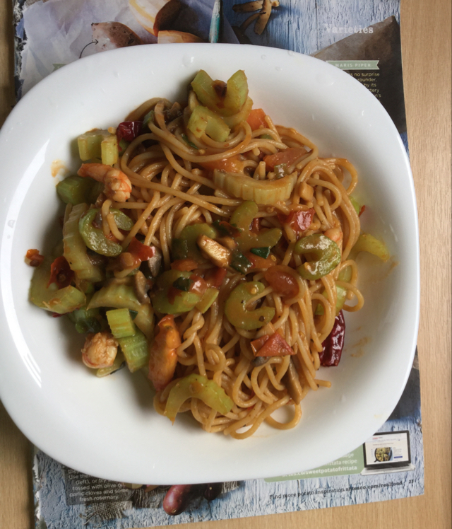 没有米粉,用的意大利面,味道也很棒~ 鸡肉也没有所以换成了虾。