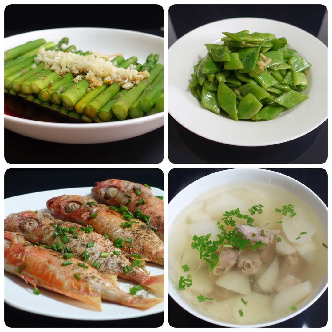 油淋芦笋;炒豆角;椒盐大眼鸡;萝卜小排汤